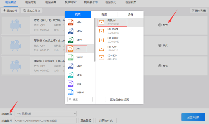 2、把视频都添加到转换器后设置好“输出格式”,输出格式又分为输出的视频格式和视频分辨率。因为要把qlv格式转换成avi格式,所以把输出的“视频格式”设置为‘avi’格式,分辨率则设置为和原来视频相同分辨率的“同原文件”格式。