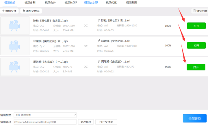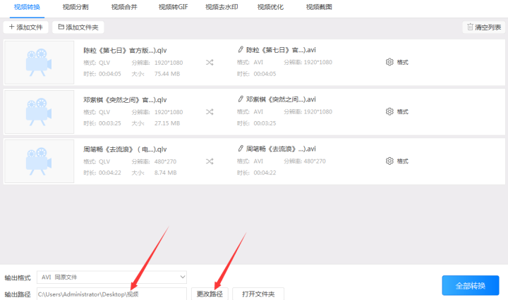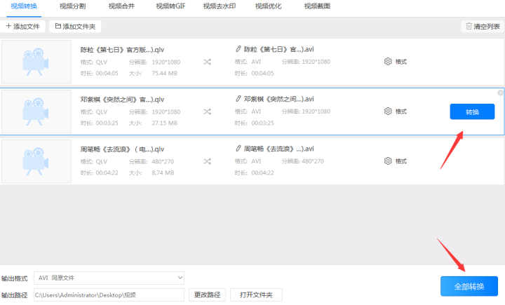 4、设置好输出路径后可以依次点击“转换”按钮单独转换视频格式,也可以直接点击右软件下角的“全部转换”按钮统一把qlv格式转换成avi。