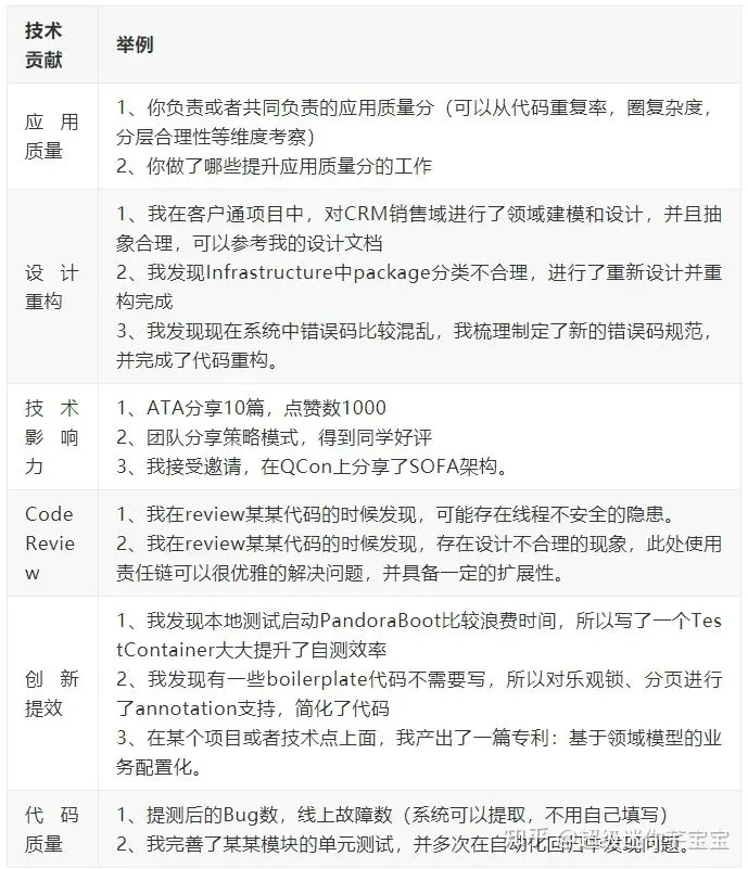 技术贡献:包括设计重构、技术影响力、Code Review、创新提效和代码质量。