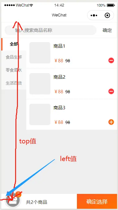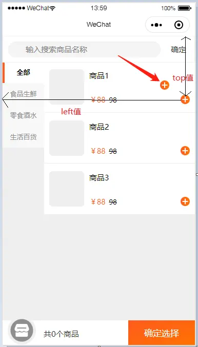 步骤二: 计算出左下角购物车距离顶端的left, top值