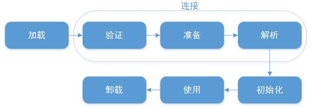 加载(Loading)、验证(Verification)、准备(Preparation)、解析(Resolution)、初始化(Initialization)、使用(Using)和卸载(Unloading)7个阶段。其中,验证、准备和解析统称为连接(Linking)。过程如下图所示: