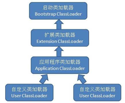 如果一个类加载器收到了类加载的请求,它首先不会自己去尝试加载这个类,而是把这个请求委派给父类加载器去完成,每一个层次的类加载器都是如此,因此所有的加载请求最终都应该传送到顶层的启动类加载器中,只有当父加载器反馈自己无法完成这个加载请求(它的搜索范围中没有找到所需的类)时,子加载器才会尝试自己去加载。