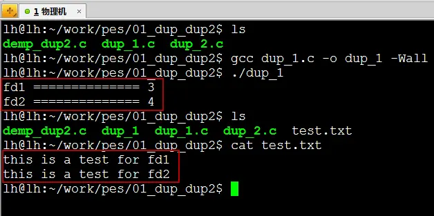 下面的例子为,打开一个文件得到文件描述符,并复制该文件描述符,通过这2个描述符分别对此文件进行写