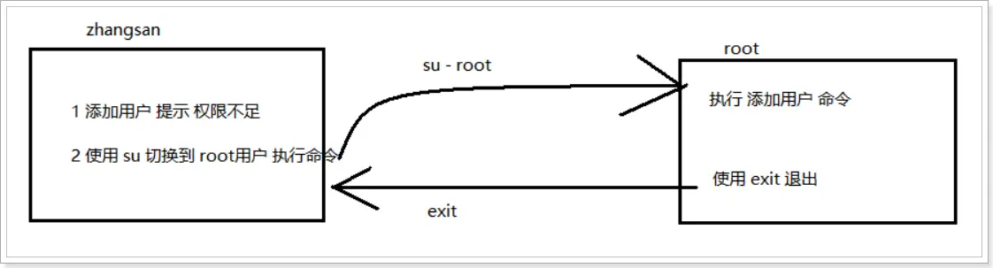 su不接用户名, 可以切换到root, 但是不推荐使用, 因为不安全exit示意图如下: