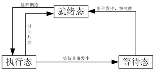 从上面的例子,我们可以得知,对于A进程而言,有时候在运行,有时候没有运行,两个状态不一样,所以,进程是有状态的,同时,状态是可以相互进行转换的,从执行的状态转换为不执行的状态,这里,我们可以把进程运行的整个生命周期简单划分为三种状态(实际上不指这三种状态):就绪态、执行态、等待态。