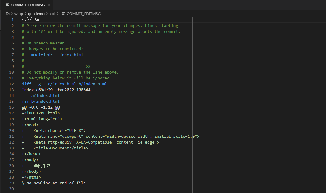 git commit -v //提交并且打开默认编辑器,如果git6行配置你配置了,就会打开vscode 如果没有会打开vim编辑器