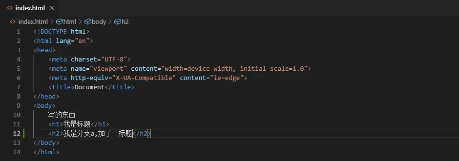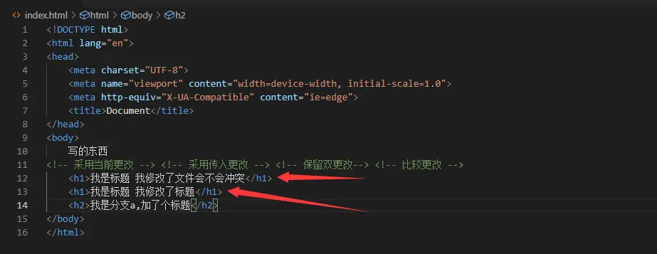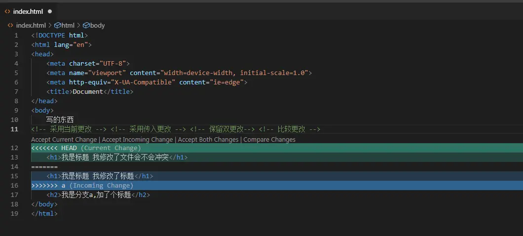 切换到a分支 修改了 h1标签里的内容导致了冲突 因为master和a分支都写了这个地方,在vscode里就会出现冲突提示