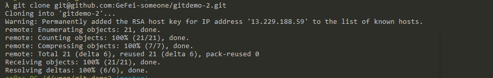 git clone origin git@github.com:GeFei-someone/gitdemo-2.git // 克隆项目