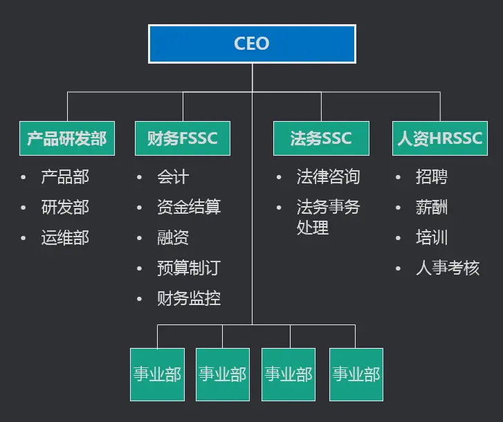 Service Center),人力资源共享服务中心HRSSC(Human Rersources Shared Service Center),其实就是典型的中台管理思路下的组织形态和职能部门建设的方法,如下图。