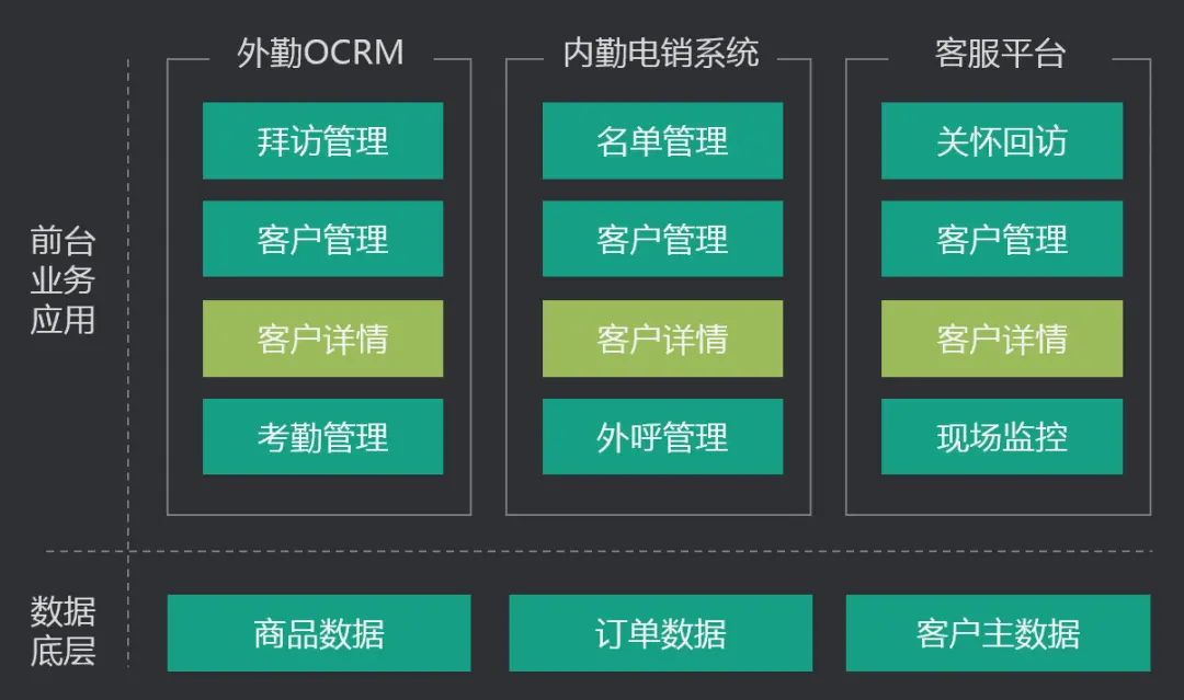 某流量型互联网公司,变现模式主要为针对中小企业的广告售卖,业务团队包括电话销售团队(IS,Inbound Sales),外勤线下销售团队你(OS,Outbound Sales),以及客服团队。三个业务团队有着各自独立的业务系统支持其运转,每个业务系统中既有个性化功能,例如针对IS的外呼管理、针对OS的拜访管理、针对客服的关怀回访;也有功能高度类似的重复功能,例如客户管理列表,客户详情页。系统架构图如下图所示。