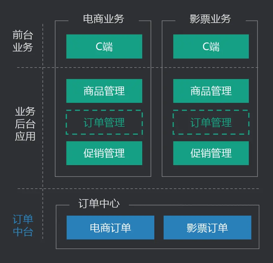 某互联网公司同时开展了电商业务和电影票业务。每条业务线都有独立的C端系统、后台交易系统(包括商品管理、订单管理、促销管理)来支持业务。为了追逐潮流,公司决定将两条业务线的订单中心合并,实现订单中台,如下图。