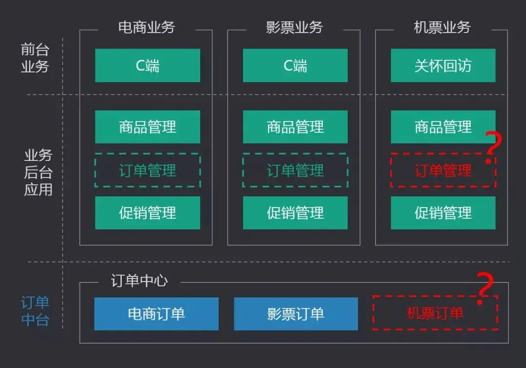 现在,公司管理者以为拥有了强大的“订单中台”,可以为任何新业务的快速开展提供支持。很快,公司决定开展机票售卖业务,针对机票业务,有独立的C端,商品管理,促销管理。但是当产品经理和工程师开始期待订单中台的强大能力时,遗憾的发现订单中台无法给机票业务提供任何现成的功能复用能力,机票的订单模型和电商以及影票都不相同。