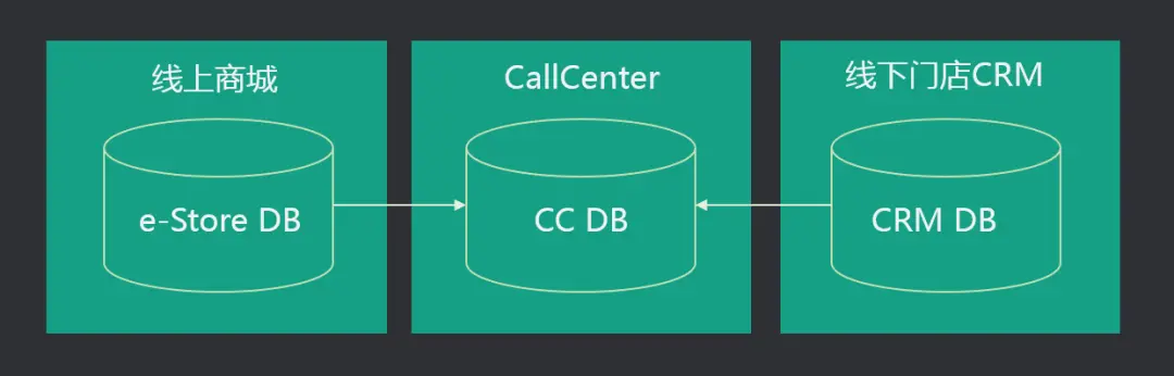 某公司开展了线下零售店和线上商城两条业务线,由于这两条业务线开展之初是独立经营建设管理,因此系统建设也是由两个产研团队分别负责,这就造成了线上和线下业务分别有一套客户数据库。现在公司设立了独立的客服一级部门同时服务于线上线下业务,而客服人员使用的客服业务系统,是不能同时访问两套客户数据库的,因此只能将两套客户数据库冗余成一套针对客服业务系统使用的客户数据库。此时,公司内部一共有三套客户数据库,各自像孤岛一样存在。如下图所示。