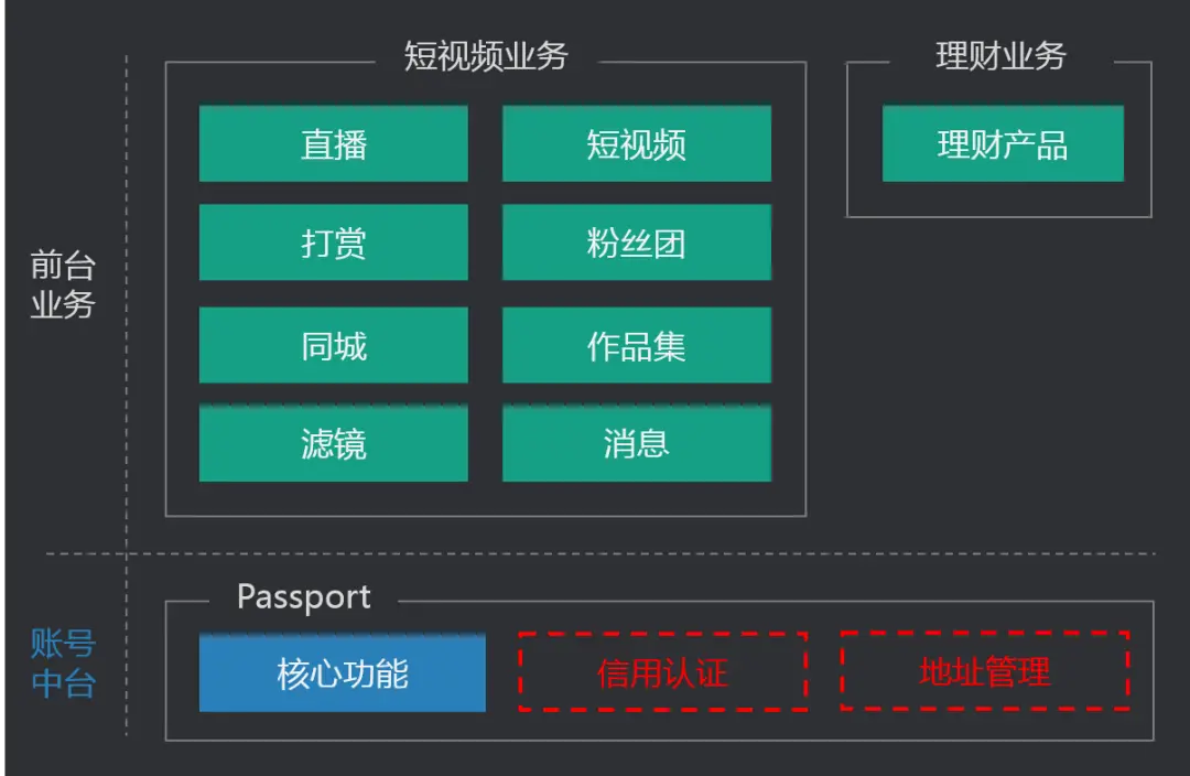 公司的短视频业务的账号中心,建设初期就采用了服务化的思路,因此很好的和短视频前台业务的C端APP实现了解耦合,实际上已经实现了中台化的建设部署。面对新开展的理财业务,产研负责人决定复用一套账号中心(Passport),从而发挥中台产品优势,为新业务赋能。理财业务的产品技术体系是独立的,虽然想完全独立研发所有的前后端系统,但是迫于压力,不敢违背公司搞大中台、小前台的指导思想,决定复用基于短视频业务构建的账号中心中台来开展业务。整个架构图如下图。
