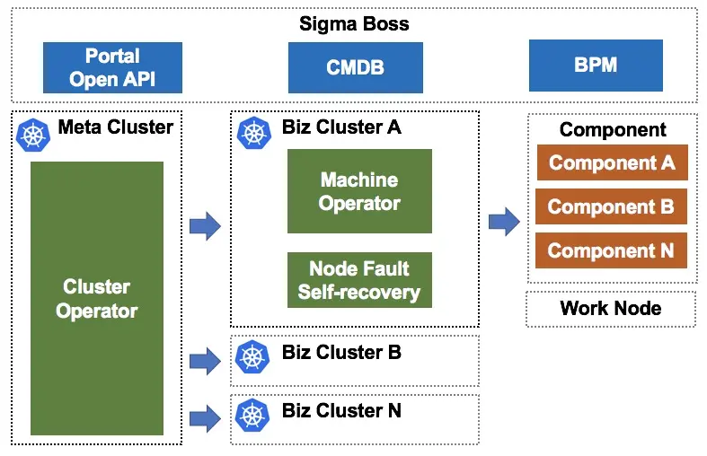 业务集群中部署有 Machine-Operator 和节点故障自愈组件用于管理业务集群的工作节点,提供节点新增、删除、升级和故障处理能力。在 Machine-Operator 提供的单节点终态保持的能力上,SigmaBoss 上构建了集群维度灰度变更和回滚能力。