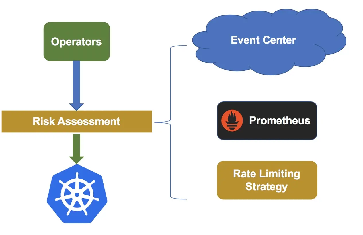 在 Machine-Operator 提供的原子能力基础上,系统中设计实现了集群维度的灰度变更和回滚能力。此外,为了进一步降低变更风险,Operators 在发起真实变更时都会进行风险评估,架构示意图如下。