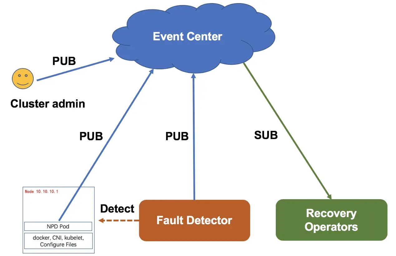 如下图所示,故障发现方面,采取 Agent 上报和监控系统主动探测相结合的方式,保证了故障发现的实时性和可靠性(Agent上报实时性比较好,监控系统主动探测可以覆盖 Agent 异常未上报场景)。故障信息统一存储于事件中心,关注集群故障的组件或系统都可以订阅事件中心事件拿到这些故障信息。