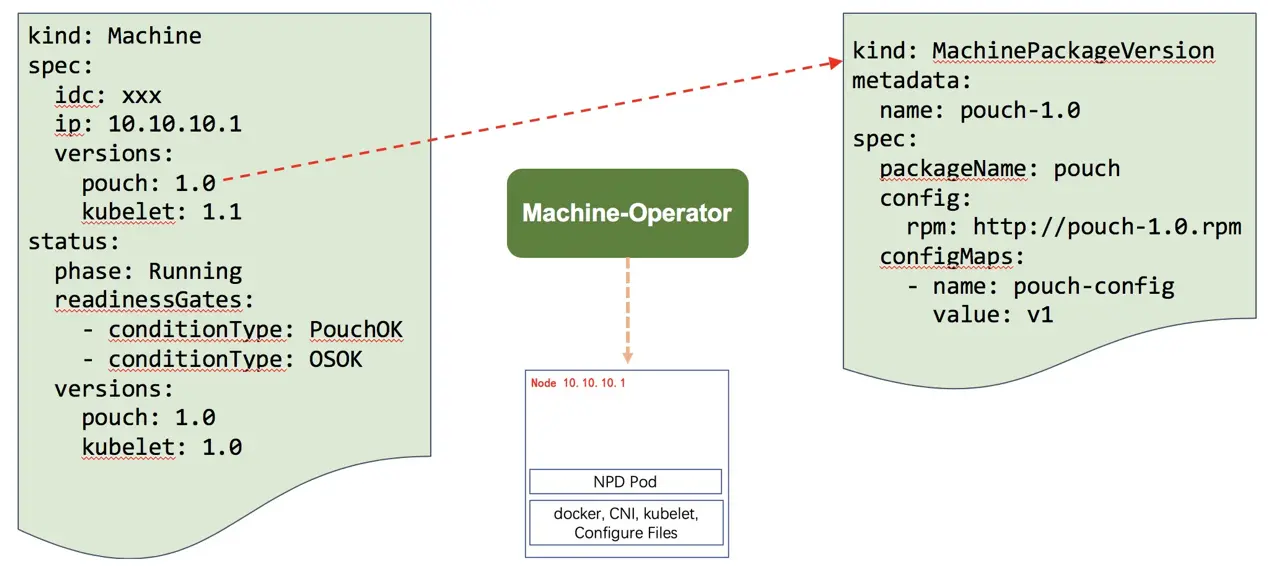 在 Machine、MachinePackageVersion CRD 基础上,设计实现了节点终态控制器 Machine-Operator。Machine-Operator watchMachine 资源,解析 MachinePackageVersion,在节点上执行运维操作来驱动节点达到终态,并持续守护终态。