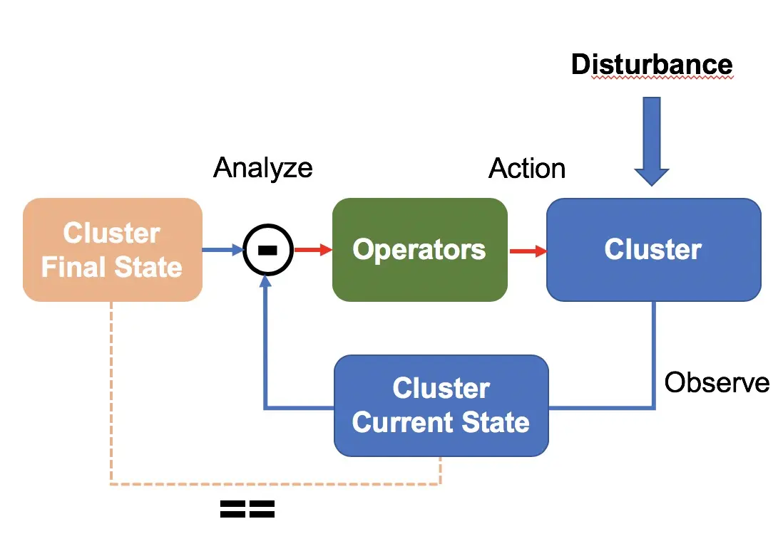 基于这些背景,我们设计了一个面向终态的集群管理系统。系统定时检测集群当前状态,判断是否与目标状态一致,出现不一致时,Operators 会发起一系列操作,驱动集群达到目标状态。这一设计参考控制理论中常见的负反馈闭环控制系统,系统实现闭环,可以有效抵御系统外部的干扰,在我们的场景下,干扰对应于节点软硬件故障。