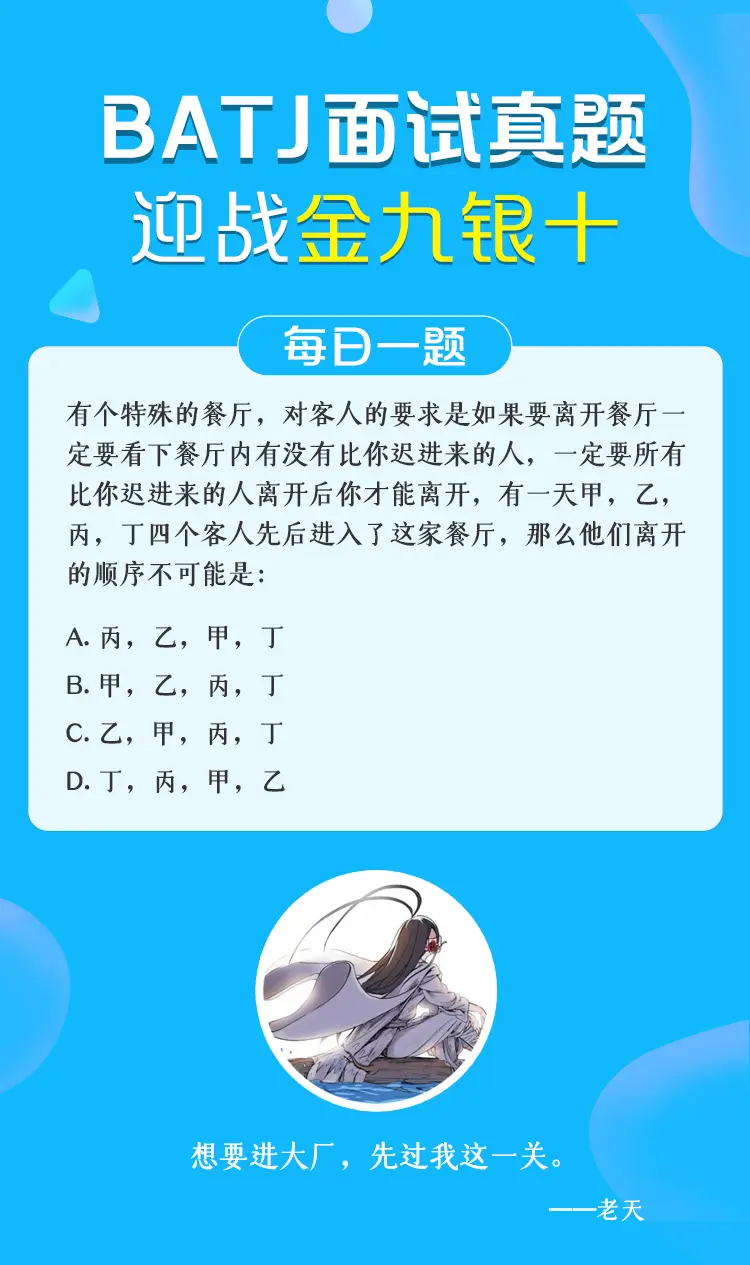 有个特殊的餐厅,对客人的要求是如果要离开餐厅一定要看下餐厅内有没有比你迟进来的人,一定要所有比你迟进来的人离开后你才能离开,有一天甲,乙,丙,丁四个客人先后进入了这家餐厅,那么他们离开的顺序不可能是: