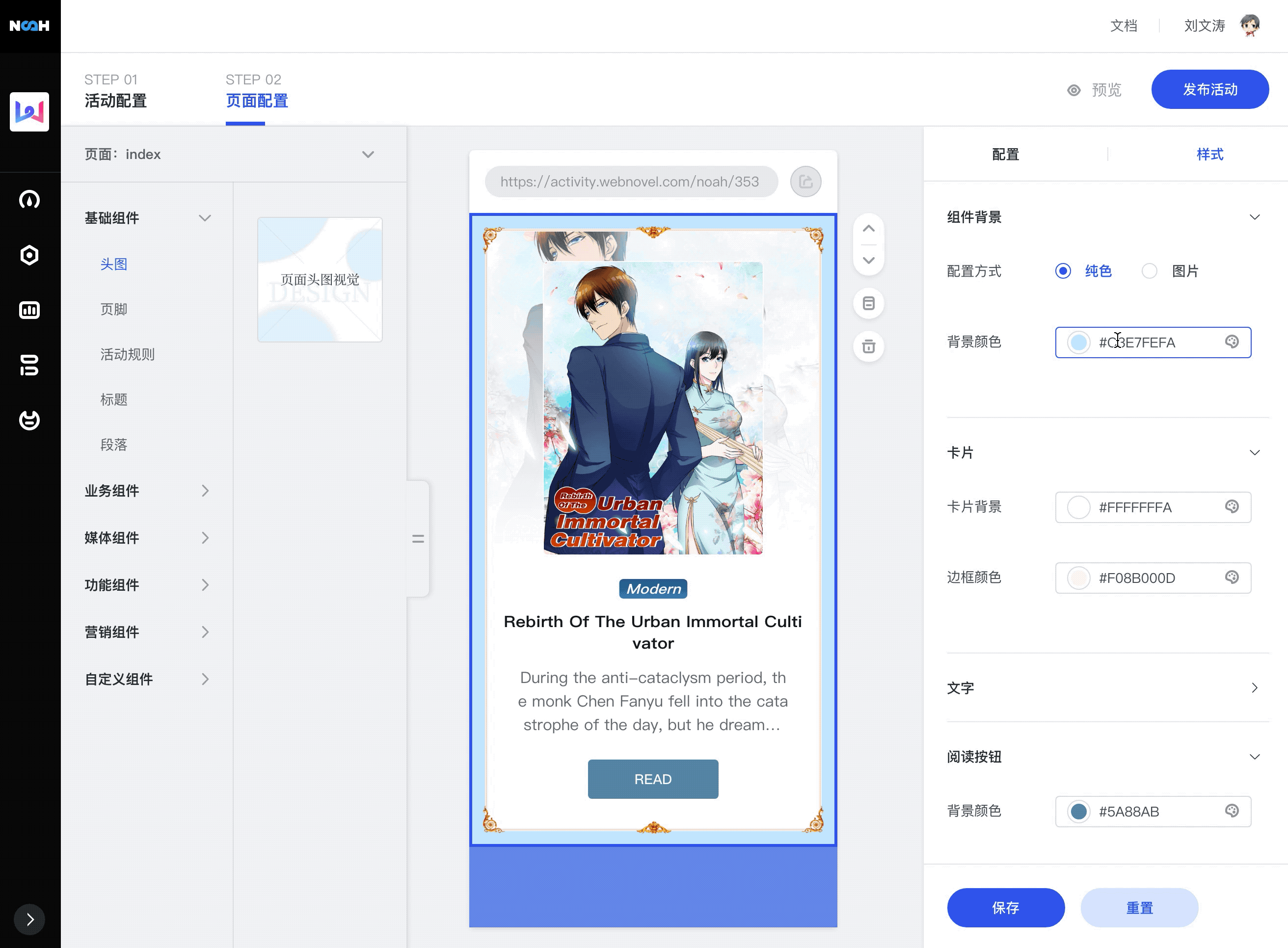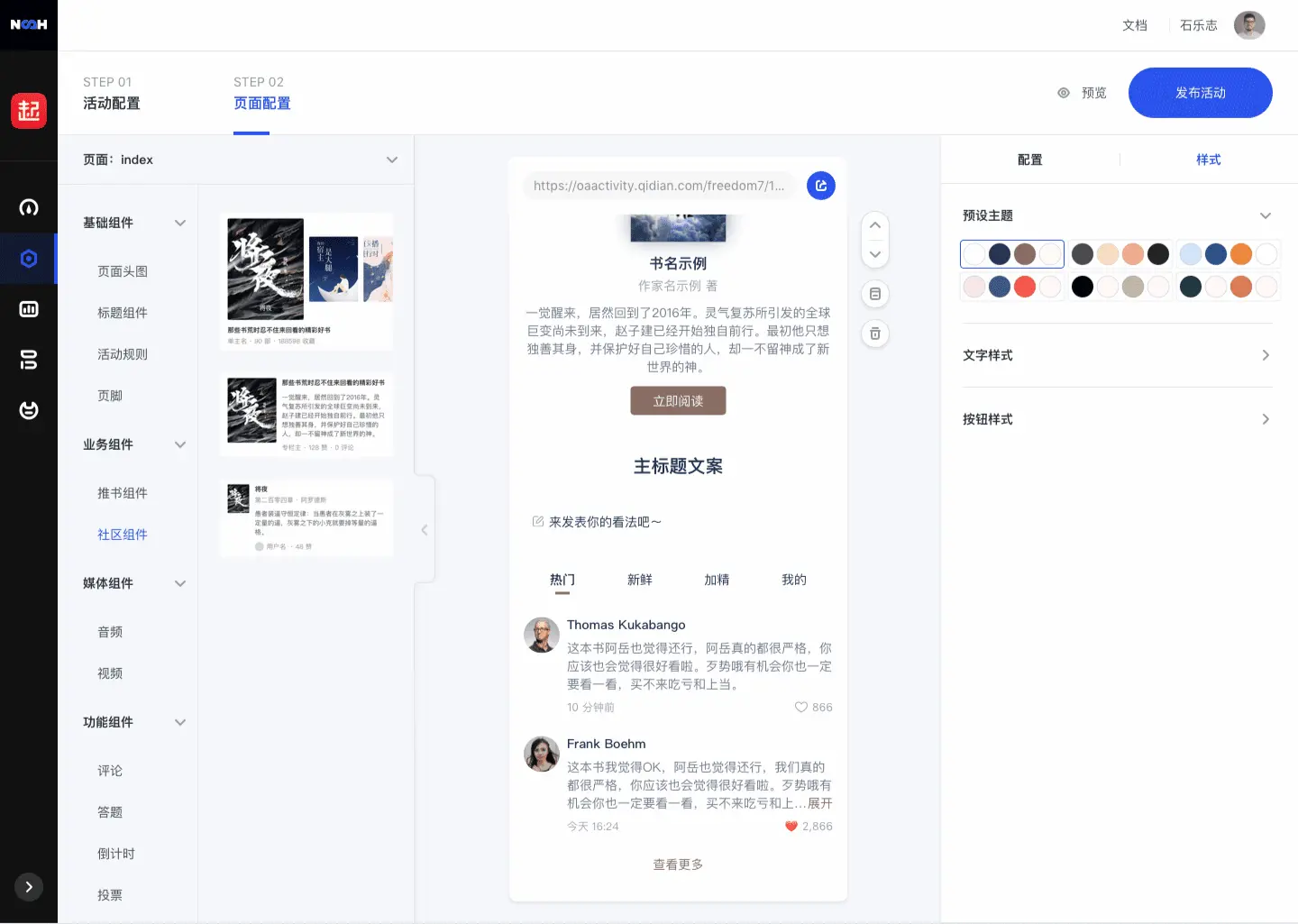 在了解主题功能之前,我们先来解下业务场景:在运营活动后台中,编辑活动配置页面,拖拽选择所需对应组件,并设置组件相应配置项,点击保存,既完成活动页面发布活动,前台就能访问对应生成活动。 编辑页面如下图: