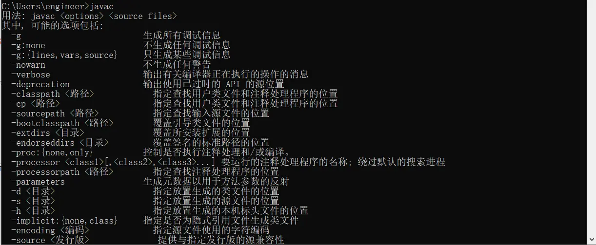 打开cmd命令行,输入java、javac、java-version,若显示如下图所示,则表明安装成功