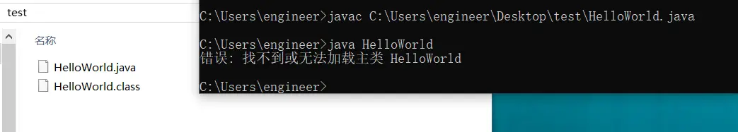 打开cmd,输入javac HelloWorld.java,可看到在此文件夹下生成了HelloWorld.class文件,然后输入java HelloWorld,运行此class文件,即可看到可能出错了,提示“找不到或无法加载主类”