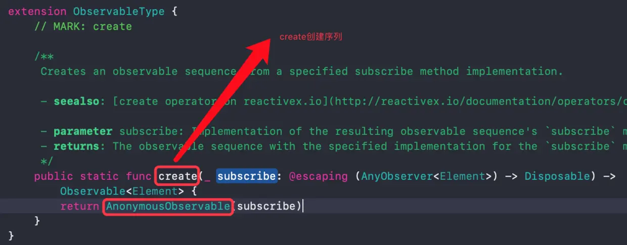 -create 方法的时候创建了一个内部对象 AnonymousObservable -AnonymousObservable 保存了外界的subscribeHandler闭包
