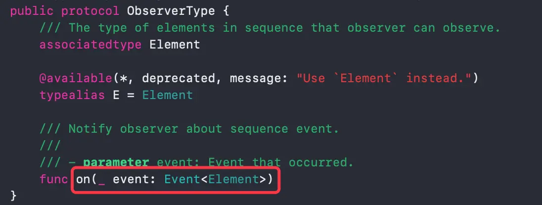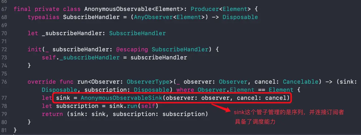 -Element 是 Swift 的关联类型,这里的这个Element就是我们的序列类型 -创建了一个 AnonymousObserver (匿名内部观察者) ,它这里的初始化是闭包参数,保存了外界的 onNext, onError , onCompleted , onDisposed 的处理回调闭包的调用