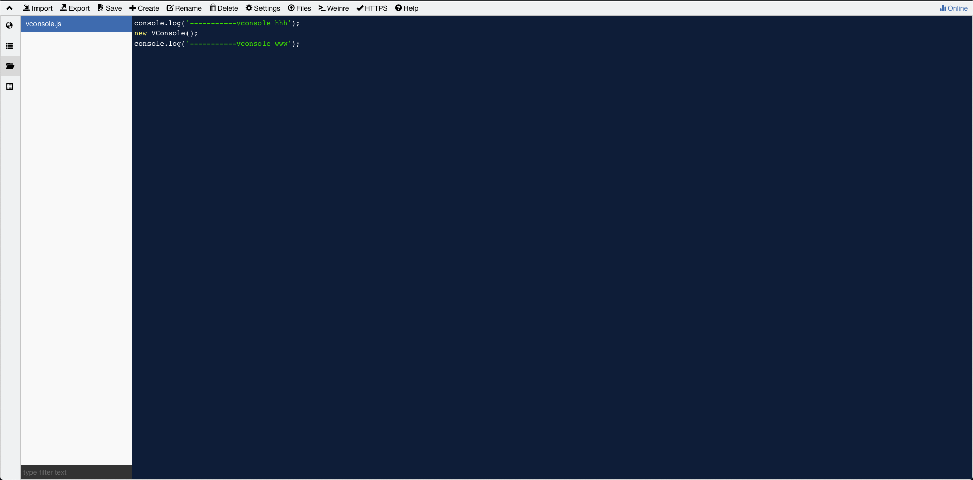 Values中添加测试js文件,文件命名随意,vconsole.js为例,内容为标记输出和vconsole的初始化console.log('-----------vconsole hhh'); <!--初始化VConsole--> new VConsole(); console.log('-----------vconsole www'); -