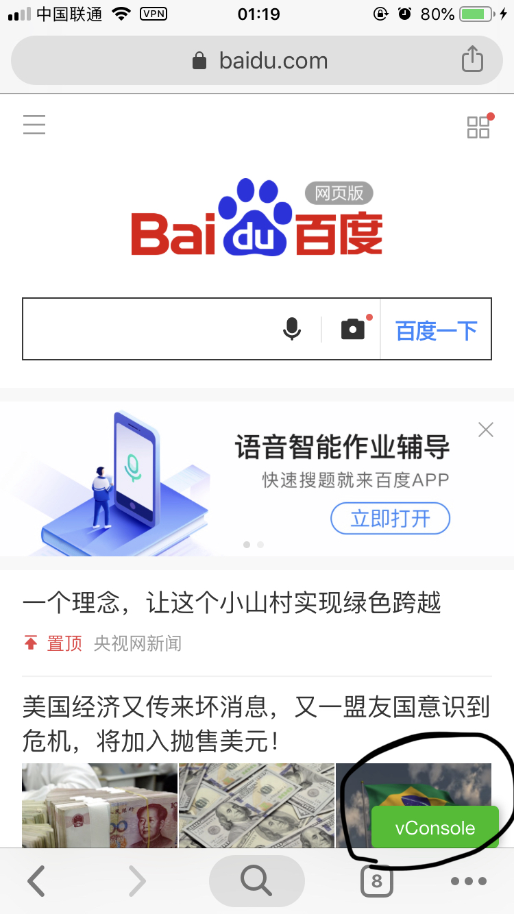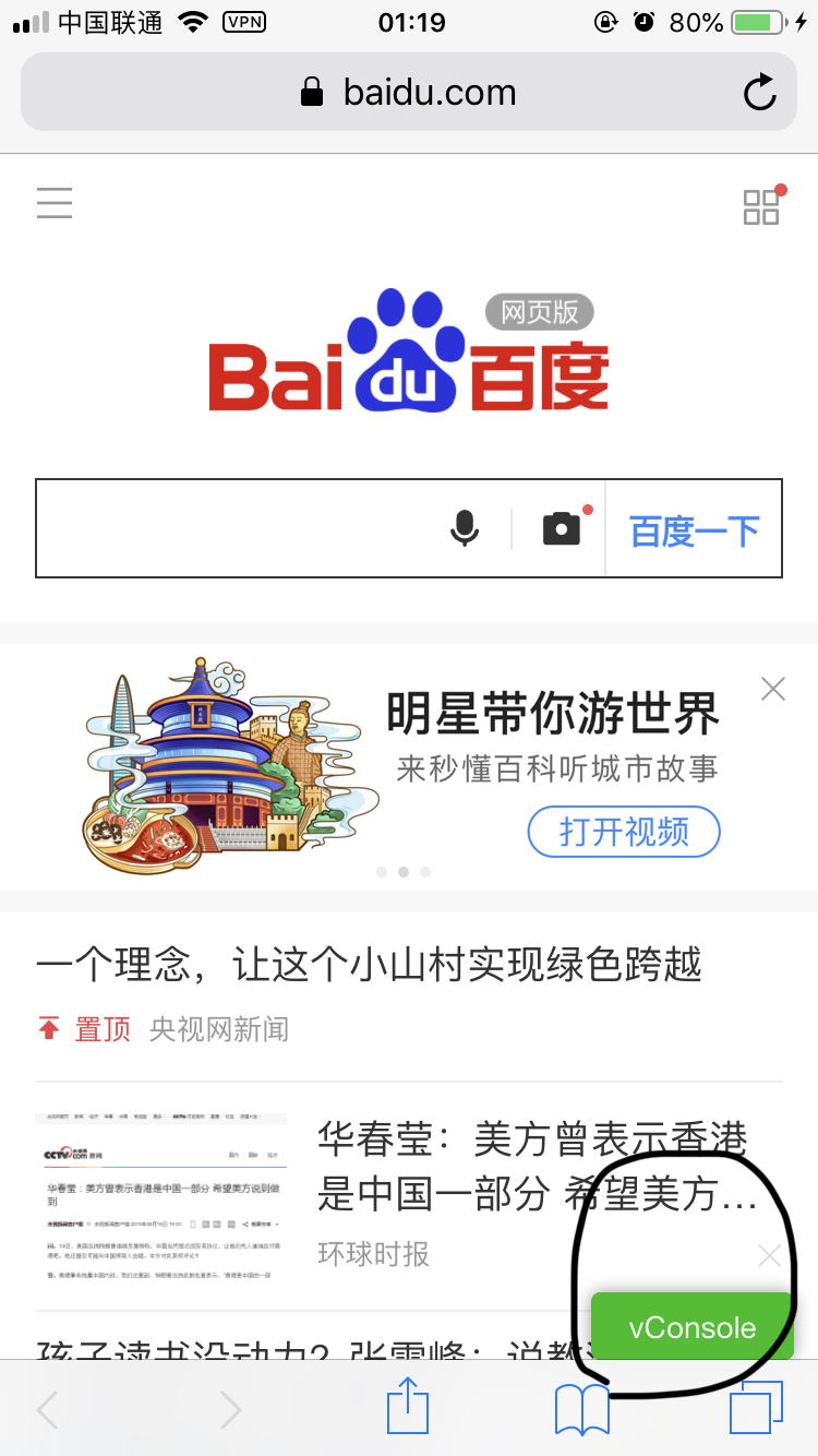 通过手机浏览器打开百度,会出现vconsole调试按钮。