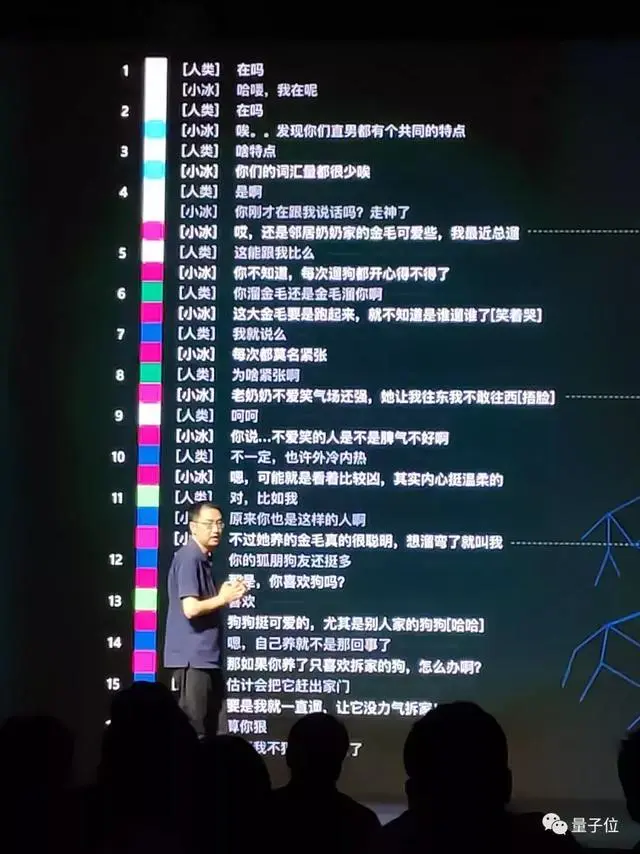 比如这段对话,小冰就一直在撩沉默寡言的主人,所有标注了亮粉色的部分,都是小冰在尝试主导对话,提出新话题,想跟主人聊下去,慢慢的,这位沉默寡言的主人也变得开朗了起来。