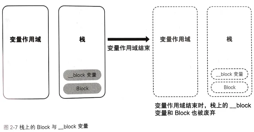 2、设置在栈上的Block,如果其所属的变量作用域结束,该 Block 就被废弃,__block 变量也会被废弃: