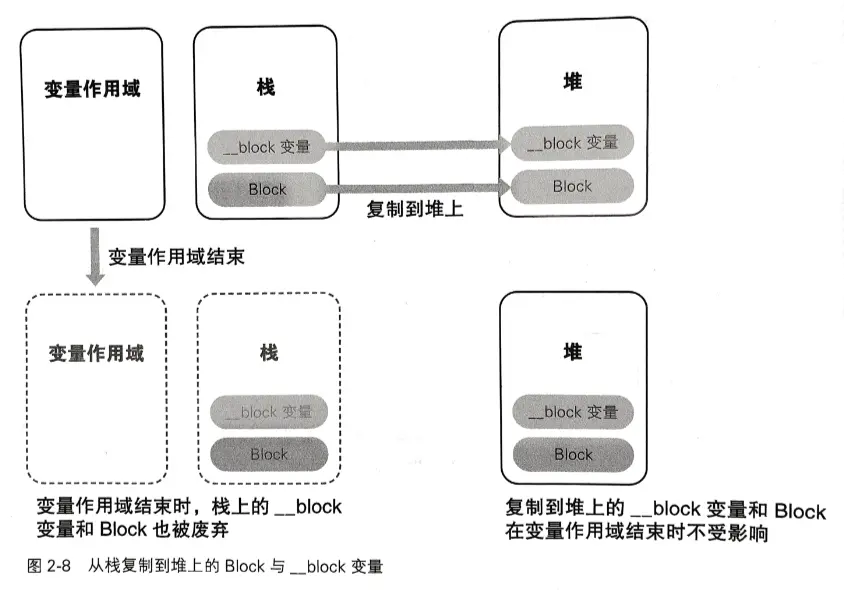 - 如果配置在堆上的 Block 被废弃,那么它所使用的 __block 变量也就被释放。此思考方式与 OC 的引用计数式内存管理相同。