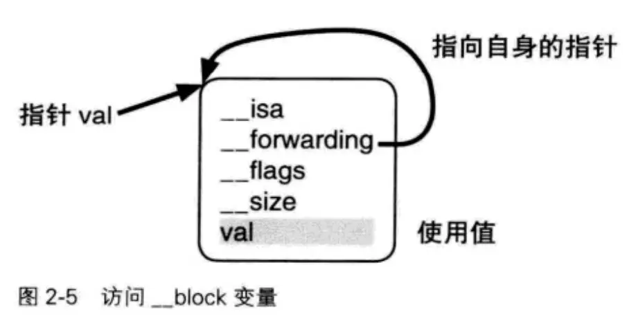 - __Block_byref_block_val_0 结构体实例的成员变量 __forwarding 持有指向该实例自身的指针