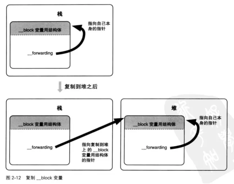 通过该功能,无论在 Block 语法位置,还是 __block 变量配置在栈上或堆上,都可以顺利访问同一个 __block 变量。