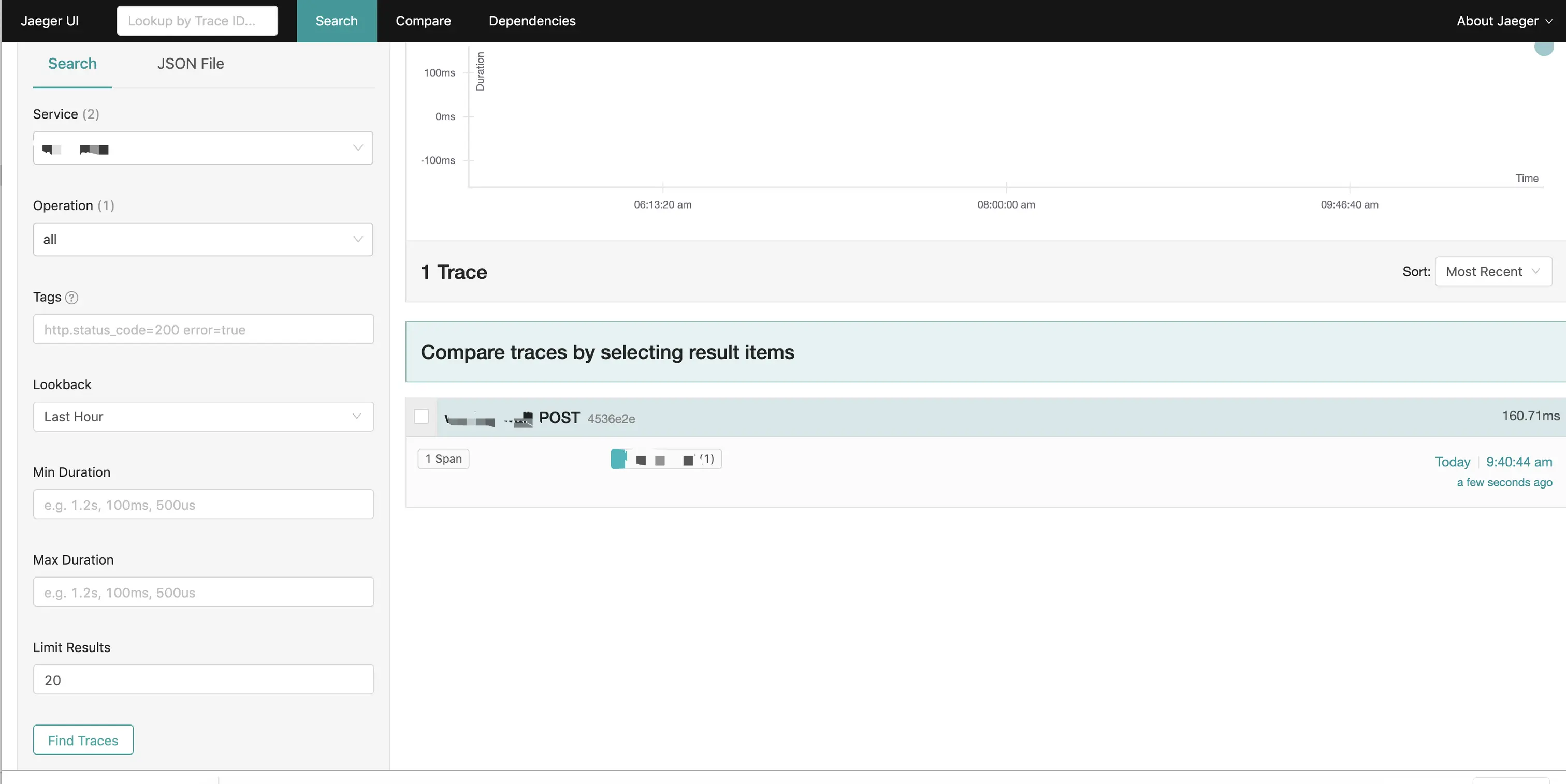 基础设施搭建好了。现在访问http://127.0.0.1:16686/search就能看到一个jaeger的查询页面了