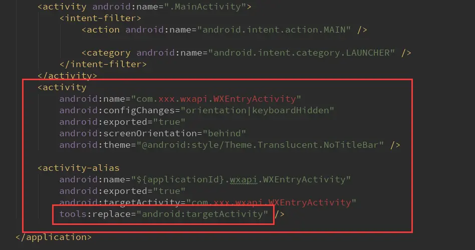 如果你的工程涉及到微信登陆,需要复写WXEntryActivity,然后继承YWXEntryActivity,manifest的写法如下图: