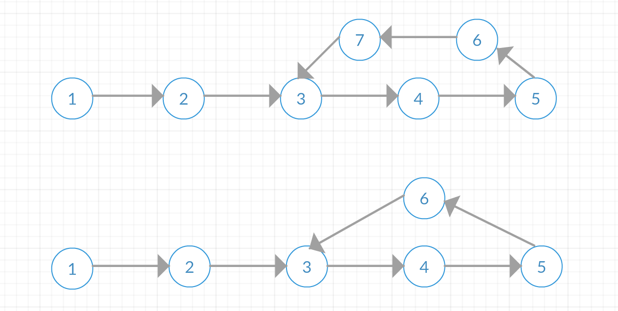 有一个单向链表,链表当中有可能出现“环”,就像题图这样。如何用程序判断出这个链表是有环链表?