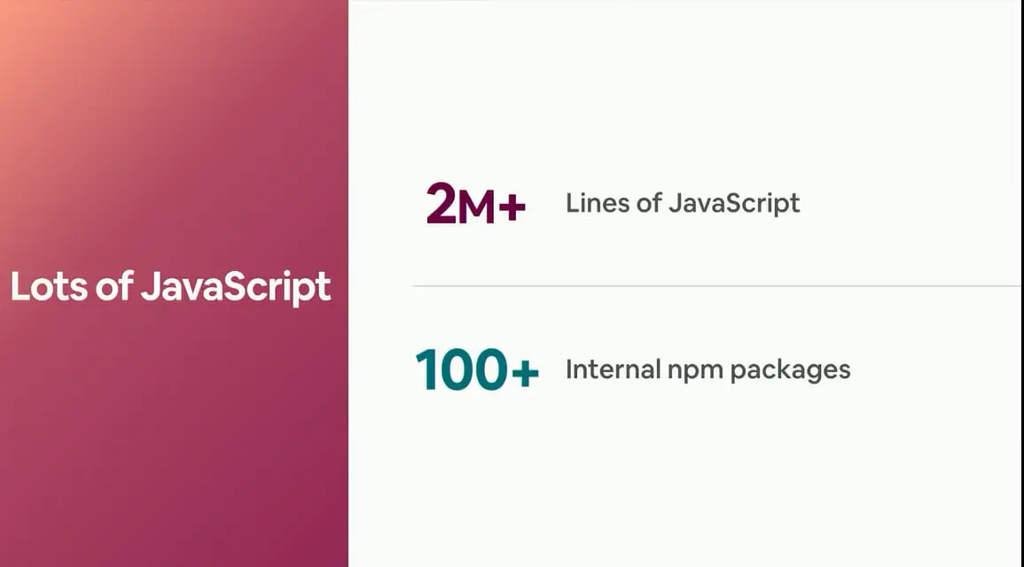 这真的有很多代码,我甚至能看到一些Backbone的代码。可以想一下JavaScript走过了多少年,它在Airbnb这里也走过了十多年。所以我们有大量的开发人员在维护这些代码,