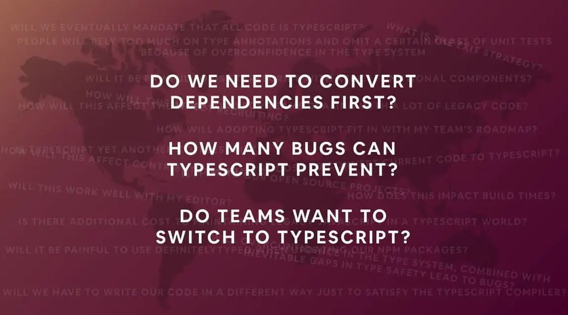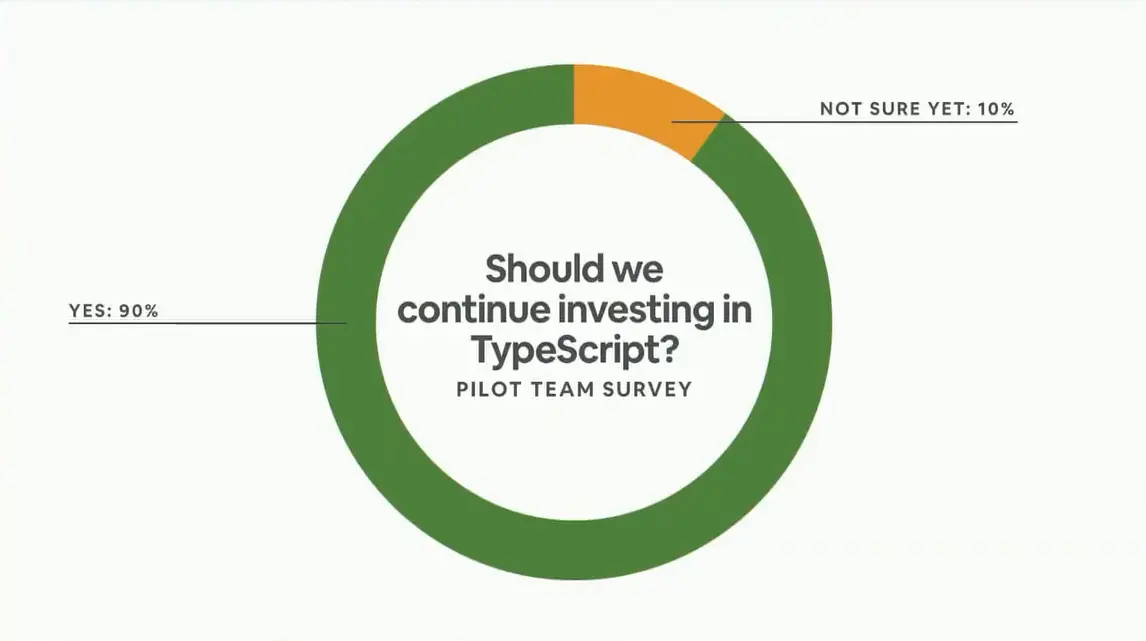 我们建立了一个聊天组,一个内部的类Stack Overflow,谷歌Email主题,github组,来供组内成员交流。 我们想确保人们能得到他们需要的帮助, 最后一步是将 typescript 完全普及化。 此时就意味着它是稳定状态,每个人都应该开始使用它, 我们目前正在努力地去接近这个目标。 剩下的步骤就是巩固风格指南、文档、加强内部培训和迁移更多代码。 到目前为止,我们大约有50%的团队使用 typescript,在主仓库中,有10%的文件已经被转换成 typescript 通过这种渐进的方法,使团队迁移至 typescript 的过程更加顺畅。 如果从第一天开始就要求每个人应该使用TypeScript, 那么接下来的每个人都会遇到同样的问题。 相反,我们先在小范围内使用 typescript ,然后总结一些经验技巧,当我们准备把它大规模推广时,这些经验技巧也会用得上。
