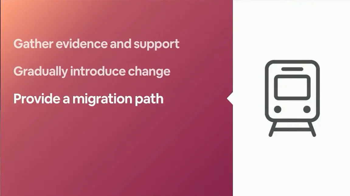 在大型组织中实施变革可能是一项挑战,但强有力的事实依据和相关问题和担忧的解决,可以使我们信服。 采用逐步变化的方式有助于减少摩擦并证明其价值。 一条明确的迁移路线能帮助团队更好的转向新的模式,同时好的工具也能促进这个过渡的过程, 我之所以开始这个工作,是因为之前有个产品组对我的工具感到失望。 当我得知公司内部其他人也有这种改变的想法的时候,我便与他们合作并将之进行下去。