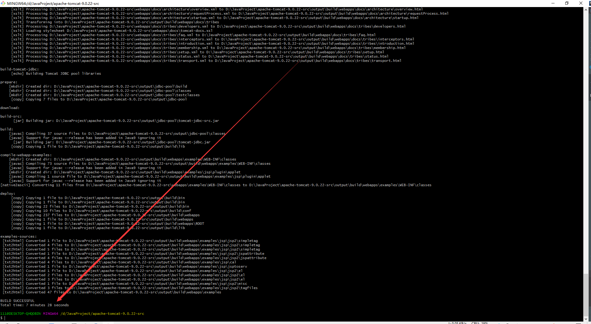 - 3、进入到上面第一步解压的 Tomcat9 目录中 cmd 或者 git bash 工具执行 ant,等个七八分钟应该就编译好了,我编译了 7 分 28 秒。