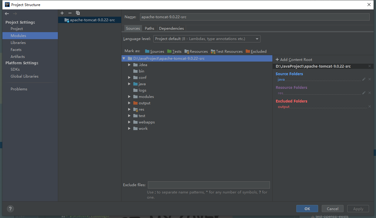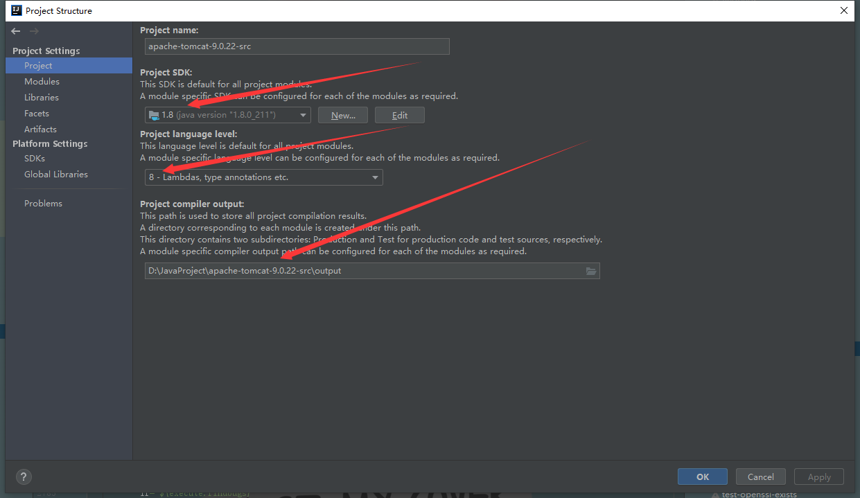 - 1.1、设置项目 SDK、Java Level、编译后文件目录分别为 jdk1.8、8、任意目录(我这儿就是项目目录下的output,这个目录也是上面 ant 编译后文件的存放目录)