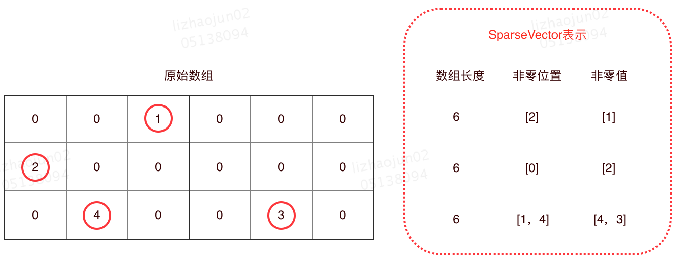 SparseVector的存储方式是:仅仅记录所有非0值,忽略掉所有0值。具体来说,用一个数组记录所有非0值的位置,另一个数组记录上述位置所对应的数值。有了上述两个数组,再加上当前向量的总长度,即可将原始的数组还原回来。