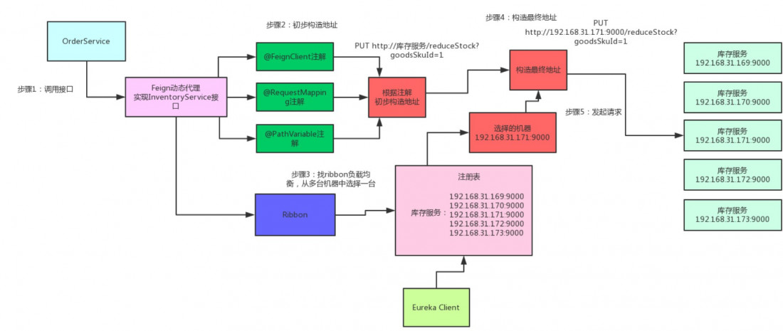 四、Spring Cloud核心组件:Ribbon说完了Feign,还没完。现在新的问题又来了,如果人家库存服务部署在了5台机器上,如下所示: