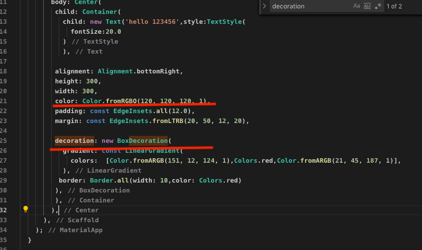 Container 的decoration属性可以设置边框、背景色、背景图片、圆角等属性,非常实用。对于transform这个属性,一般有过其他平台开发经验的,都大致了解,这种变换,一般不是变换的实际位置,而是变换的绘制效果,也就是说它的点击以及尺寸、间距等都是按照未变换前的。