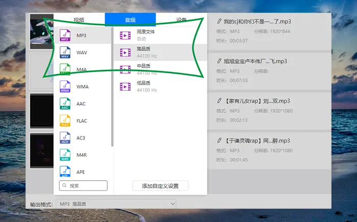 3、然后需要设置输出文件的格式,这里是将mp4视频转换成mp3音频,所以就是选择mp3音频格式输出,而音频文件的品质可以随便选择,