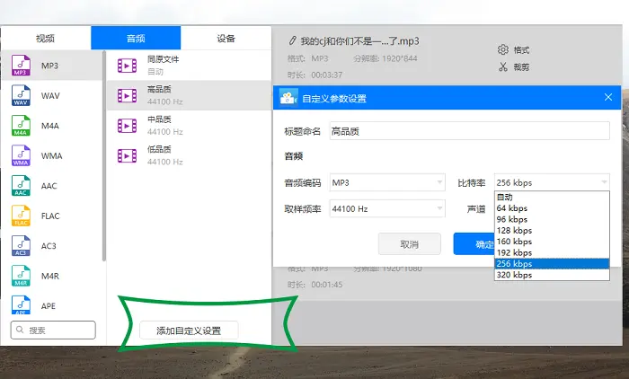 4、当然也是有很多人需要听取更加完美的音乐,所以就需要设置更多的音频参数,直接在输出格式中点击自定义设置,然后就可以选择了,