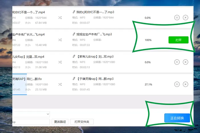 5、最后都已经设置完成后,点击全部转换按钮,然后等待软件将mp4视频全部100%转换成mp3就成功了。